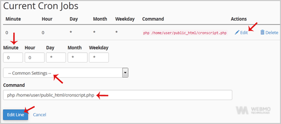 3. Scroll down to the end of page and under "Current Cron Jobs", locate your cronjob and then click on the "Edit" button.
