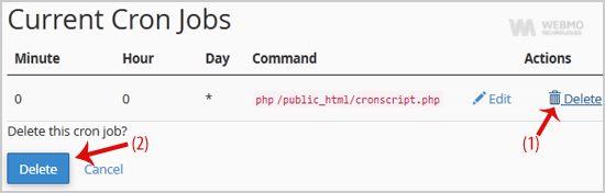 1. Under "Current Cron Jobs", locate your cronjob and then click on "Delete" button