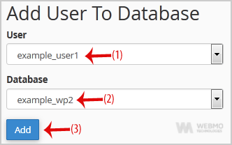 3. Scroll down to the end of the page and under "Add User to Database", select a user from the dropdown list, and then choose a Database from the list.