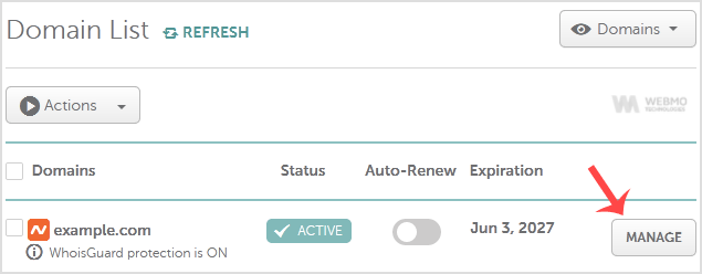 3. Under domain list, You can see list of your domains. In front of your domain click on dropdown menu and select "Manage".