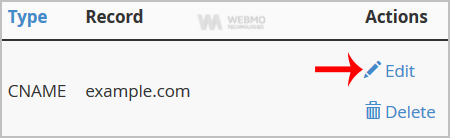 4. Locate CNAME Record you wish to edit or remove. Should you wish to edit a CNAME record, click the "Edit" option, modify the details and then click on "Save Record". Removing a record can be done with the "Delete" option.